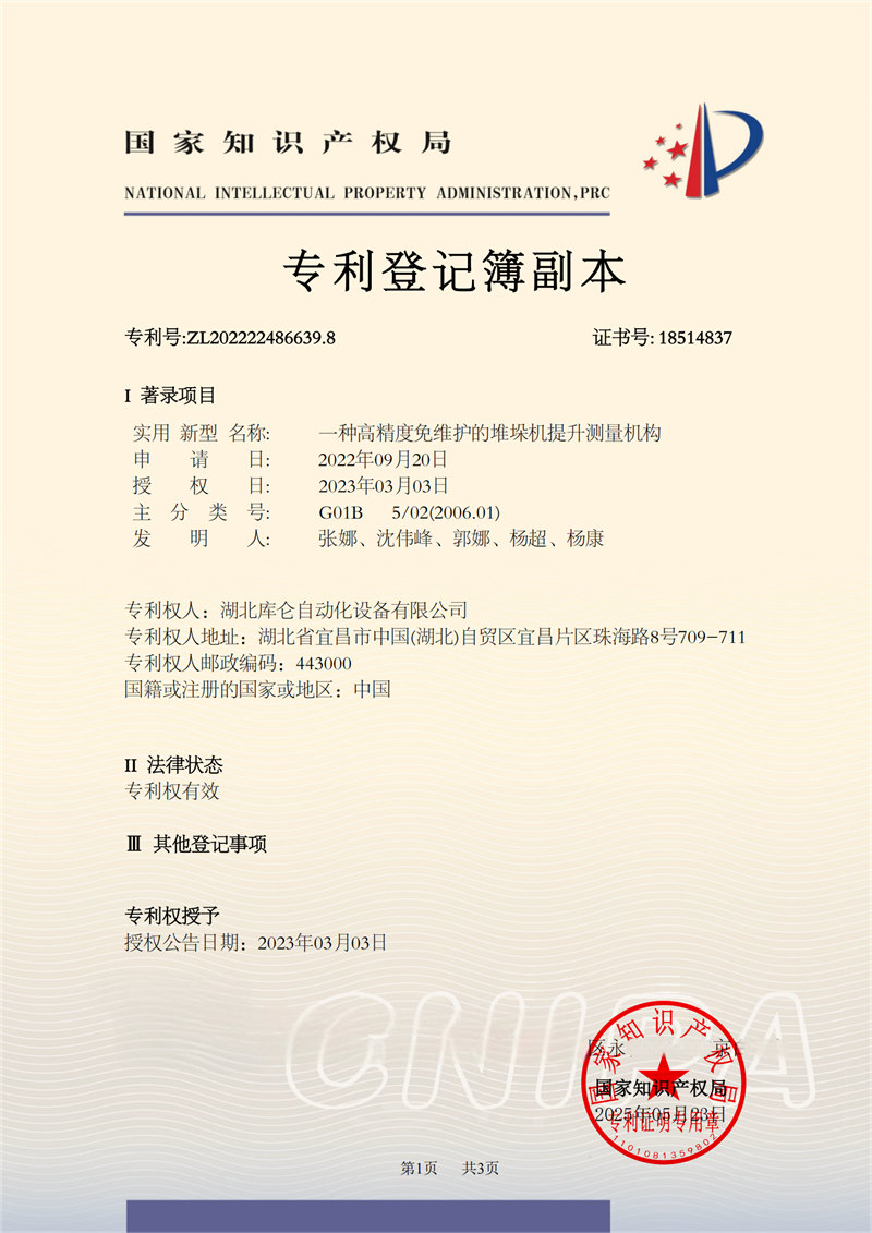 一种高精度免维护的堆垛机提升测量机构专利证书