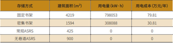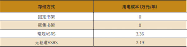 无巷道AS/RS设备用电为机器人以及服务器系统运营,根据设备供应商估算,100万册藏书量的库房一天需约耗电60度,即60/kW·h,故设备运行电力成本为:60/kW·h×1元/kW·h×365天=2.19万元。