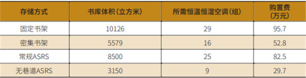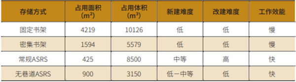 本文仅以100万册馆藏量的存储书库为例,对固定书架、密集书架、常规AS/RS以及无巷道AS/RS四种不同存储方式各项指数进行比较。